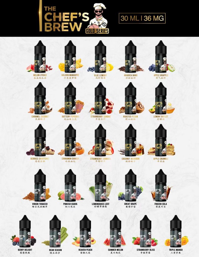 廚師佳釀煙油源自於對品質與風味的極致追求,專為喜愛電子煙的用戶設計。THE Chefs Brew 煙油由專業的「煙油廚師」精心調配,每一滴煙油都經過嚴格的品質控管,確保帶給您豐富、純正的蒸汽體驗。無論您是新手還是老手,都能滿足您的需求。